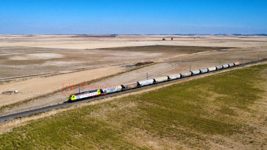 El 30 de Septiembre circula la 335.008.9 con el cereal a Babilafuente. Esta locomotora alquilada a Transfesa recibió el 19 de Agosto en los talleres de Fuencarral, los nuevos colores Blanco y Lima de Alpha Trains que ya ostentan las locomotoras alquiladas a Captrain.